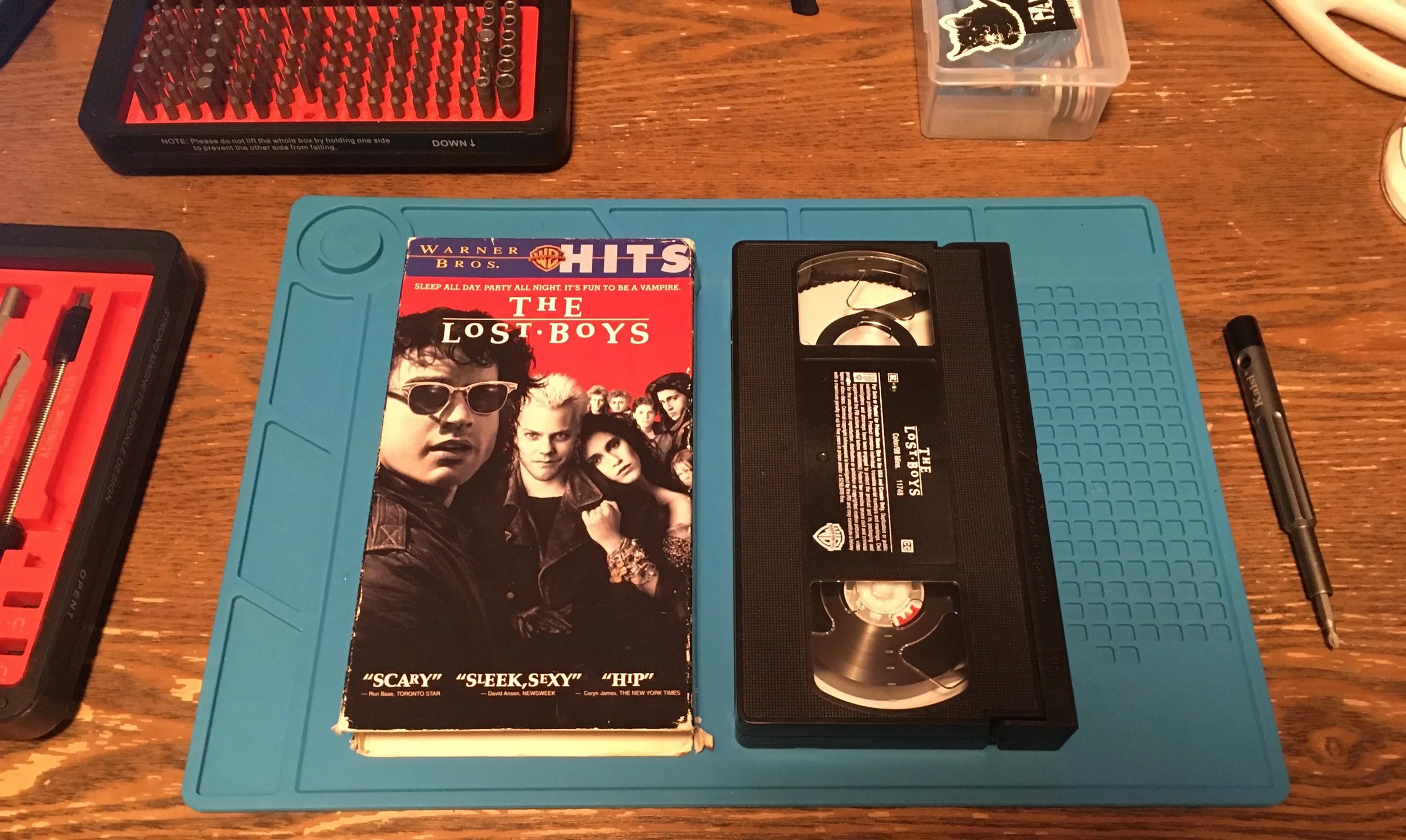 When a VHS tape gets crinkled, like in this example, the damaged section can get eaten up by the VCR. For this copy of Lost Boys (1987), on a play through this happened and when the tape was removed it caused it to rip. Here is some quick direction on how to get the tape back to a playable state albeit losing a few seconds of the recording.