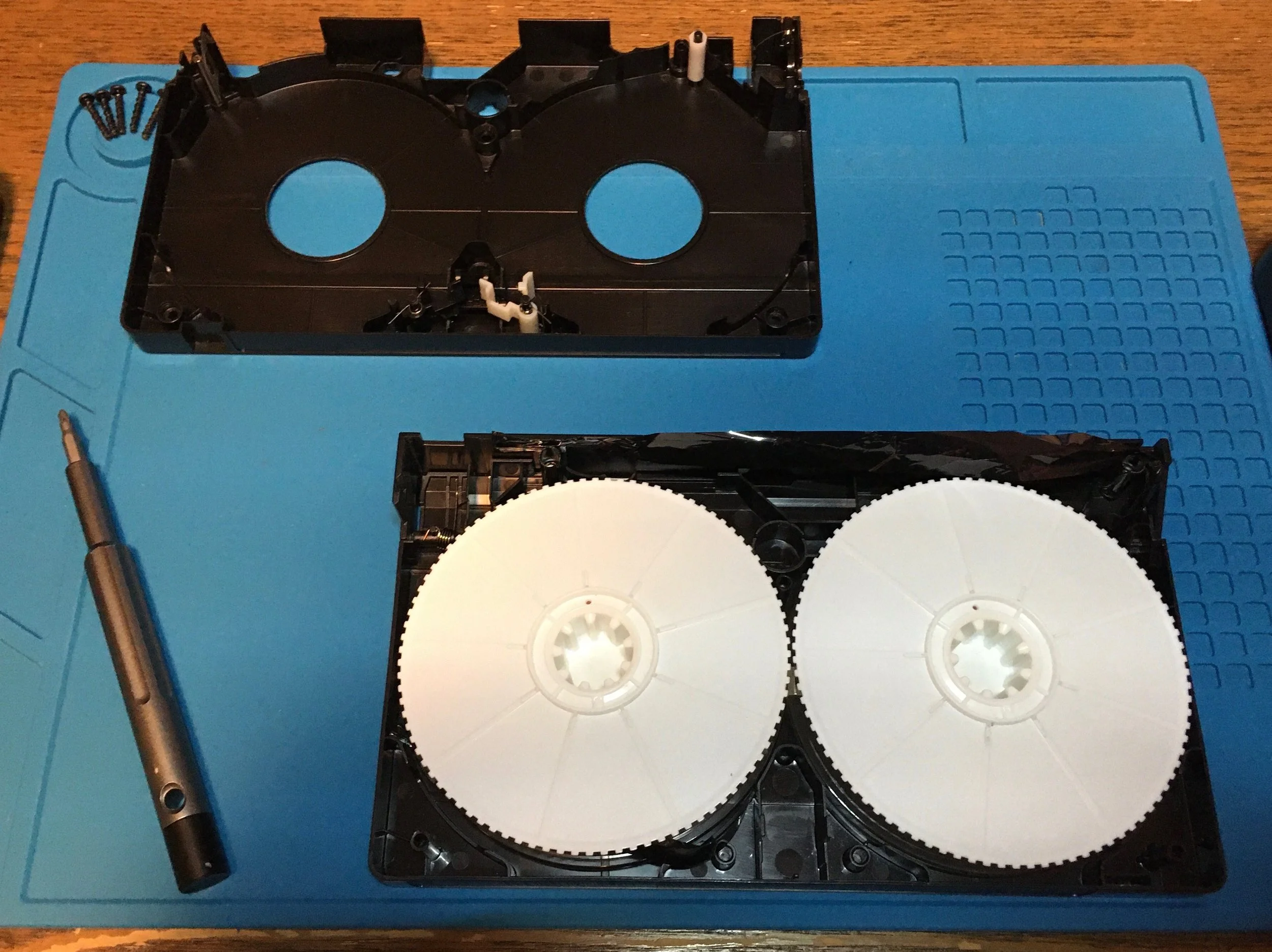 using the appropriate size driver, remove the 5 screw on the back of the VHS.