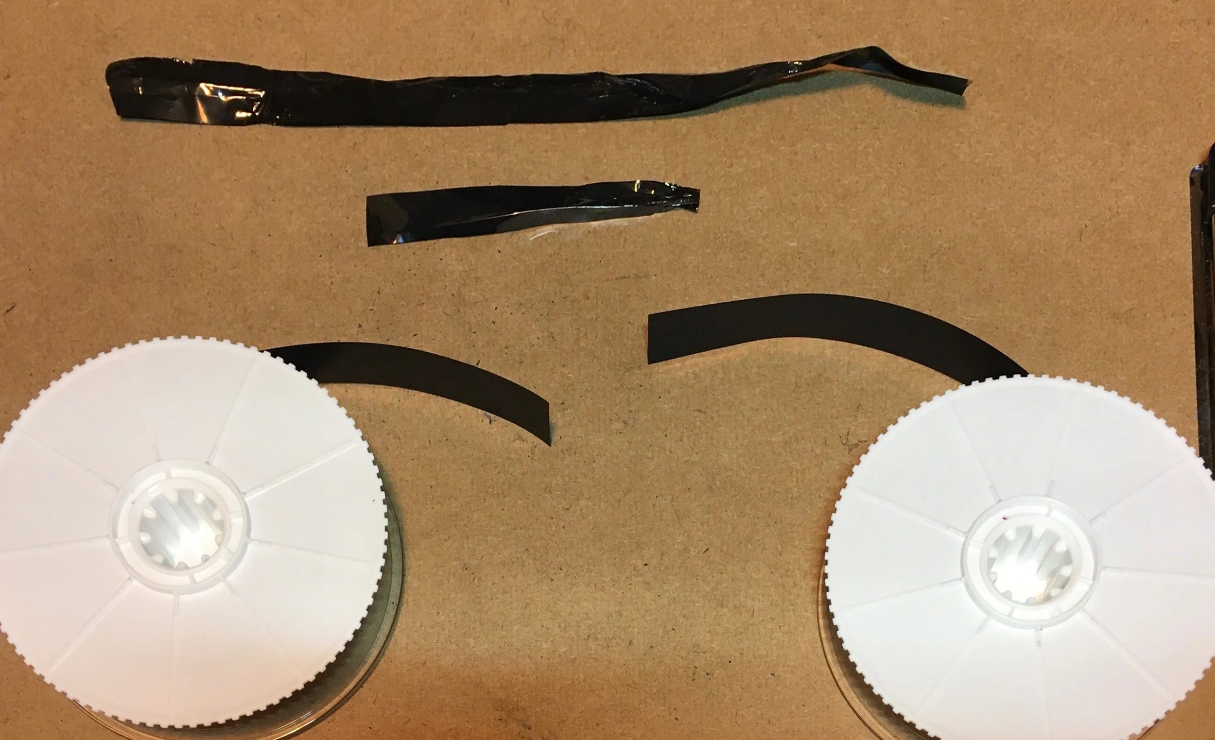 There are two sides to the VHS’s Magnetic tape. A glossy side that runs along the playback head and a matte side that doesn’t make contact with the internal mechanism of the VCR. Line up both 45 degree cuts and place a piece of scotch tape on the matte side removing any excess tape that may hang over the edges of the magnetic strip. It’s important to try and line the two pieces up as straight as possible so they run perfectly through the VCR. (There are specific tapes made for this but I’ve found that scotch tape works just as well and is more cost effective).