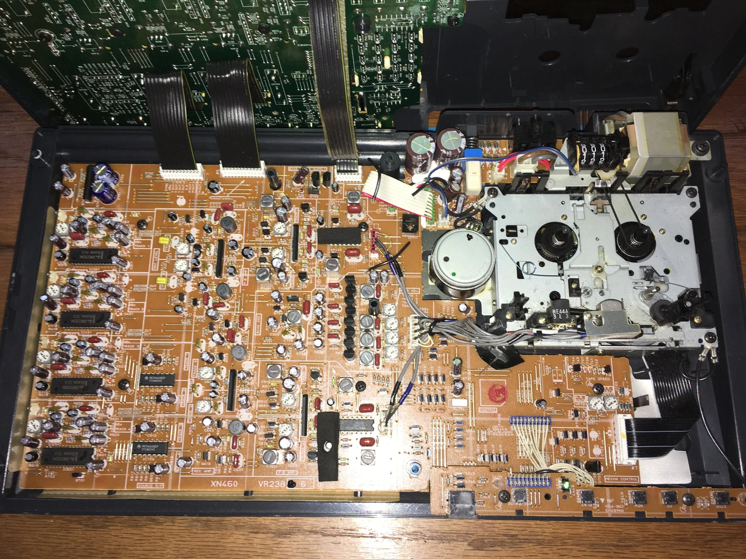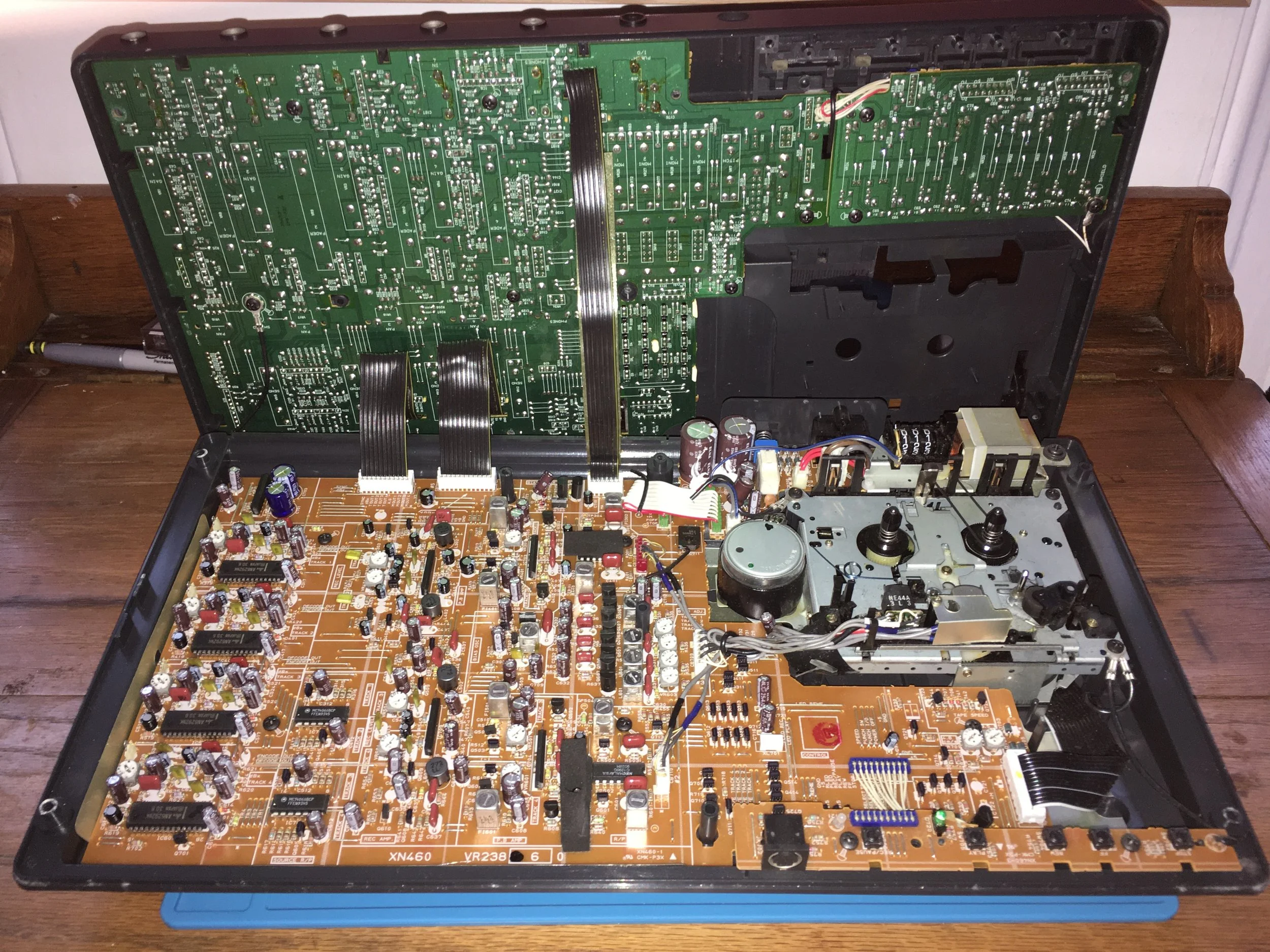 I found this multitrack cassette recorder on Facebook Marketplace. The seller knew that it turned on but hadn’t used it in it in years. When I got it home and tested it out, the take up reel wouldn’t turn and the tape would spill out of the cassette into the machine. I assumed it would just be a matter of replacing a belt but when I opened it up I found that they were actually in great condition. After a closer look around I found a small cracked plastic piece that was loose behind the cassette deck along with a spring. I was able to repair the crack in the plastic bit with a drop of super glue and then referencing a copy of the manual online I located the gear where the piece and spring were supposed to be positioned. With the piece now firmly in place, it pushes the spring against a gear which then engages with the take up reel and allows it to spin properly.